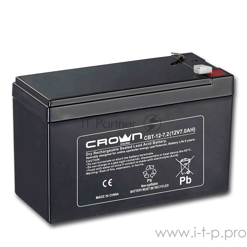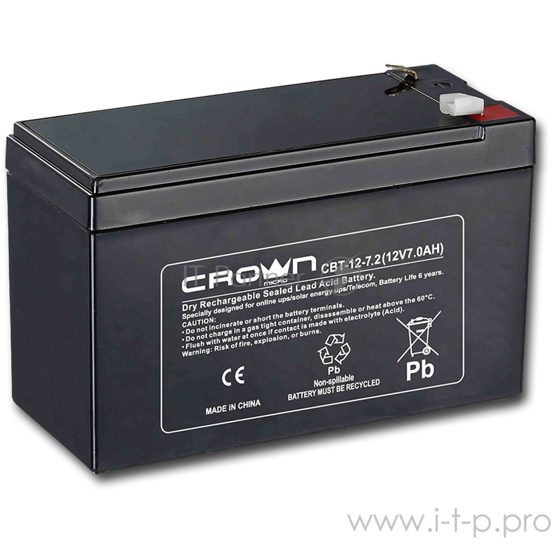 Батарея CROWN CBT-12-7.2 (напряжение 12В, емкость 7.2 А/Ч, разм 151х65х100 мм, вес 2,1 кг, тип клеммы - F2, 5 лет)