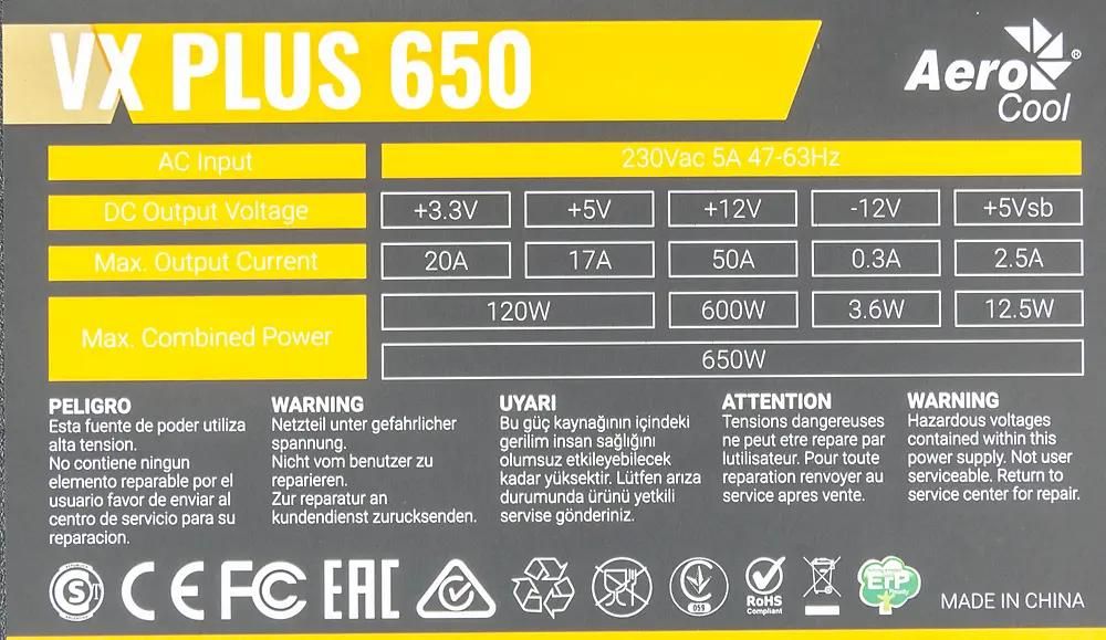 Характеристики Блок питания AeroCool 650W VX-650 PLUS