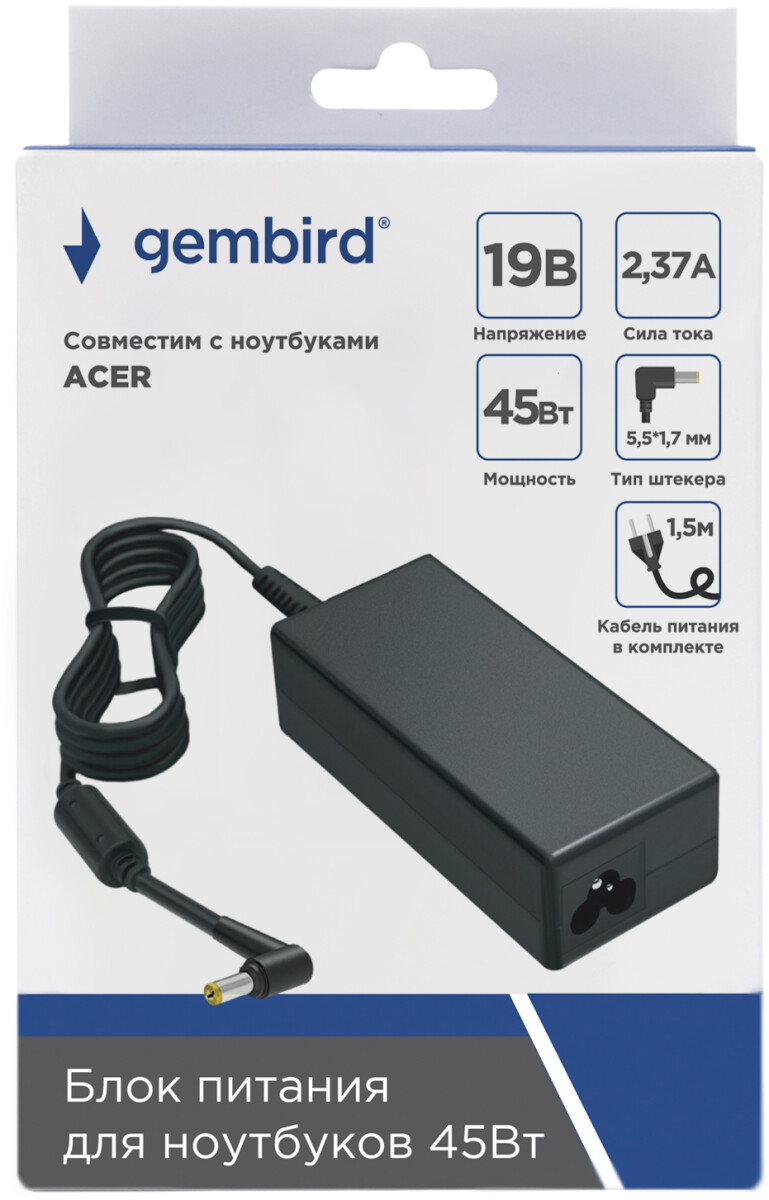 Блок питания Gembird для ноутбуков ACER NPA-AC38, 19В/2.37А, 45Вт, штекер 5.5х1.7мм, коробка