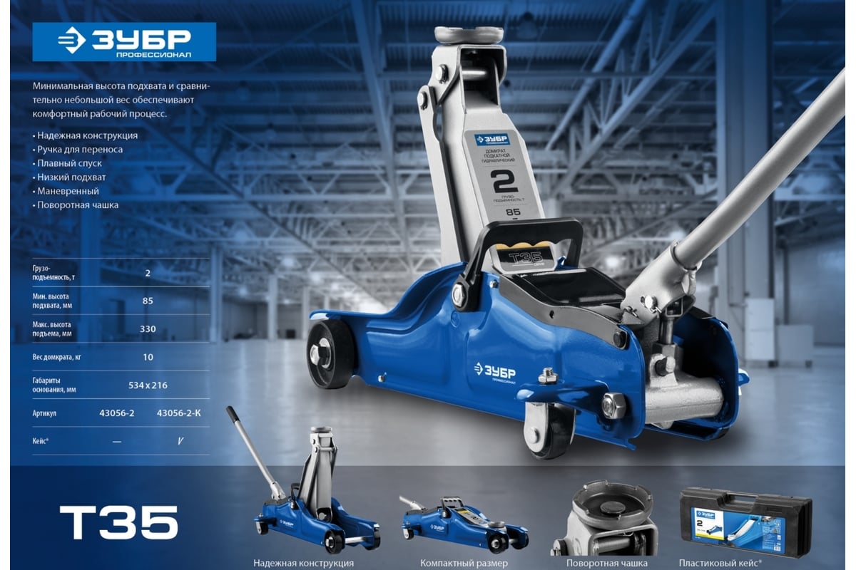 Домкрат гидравлический подкатной T35, 2т, 85-330мм, ЗУБР Профессионал 43056-2 [43056-2]