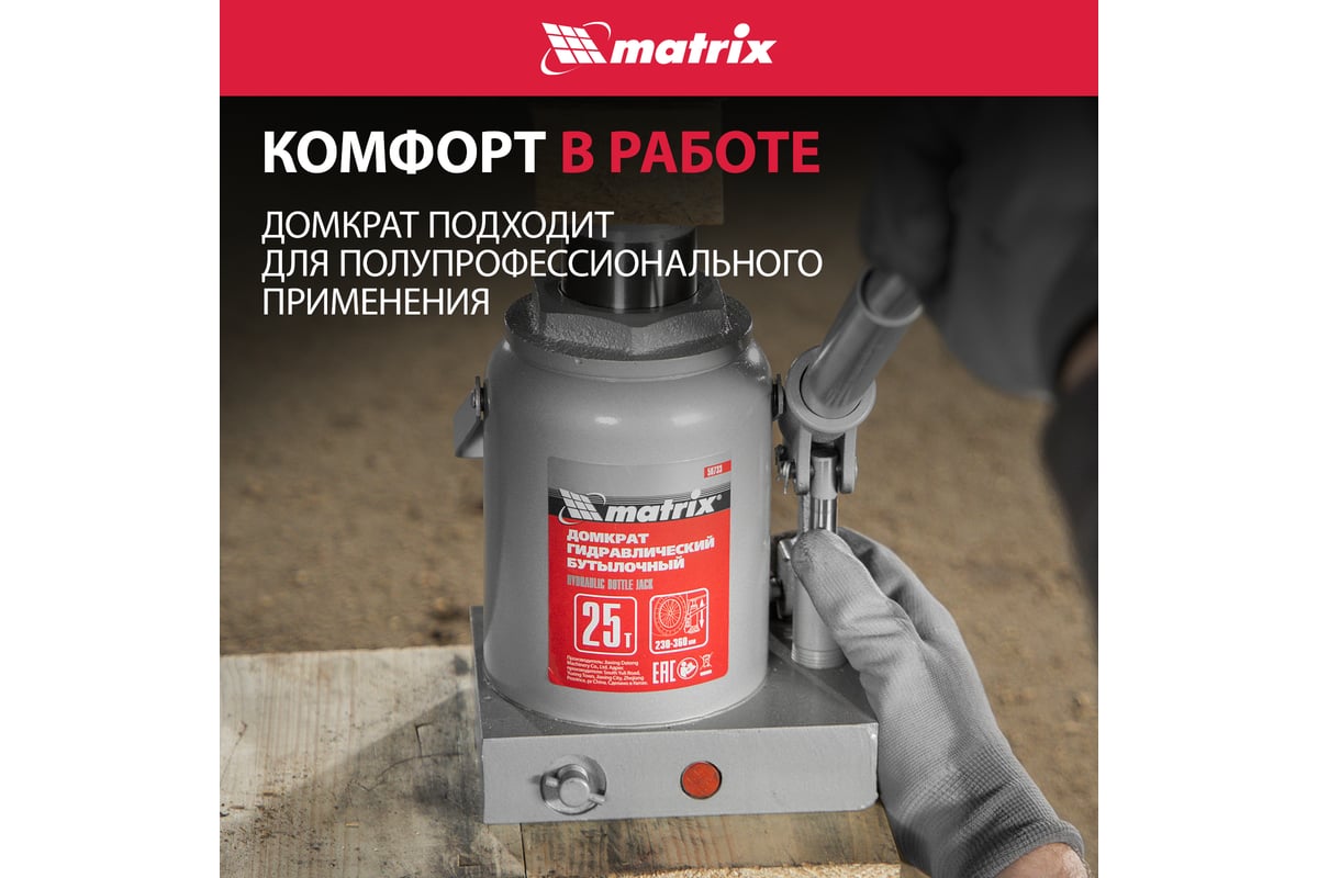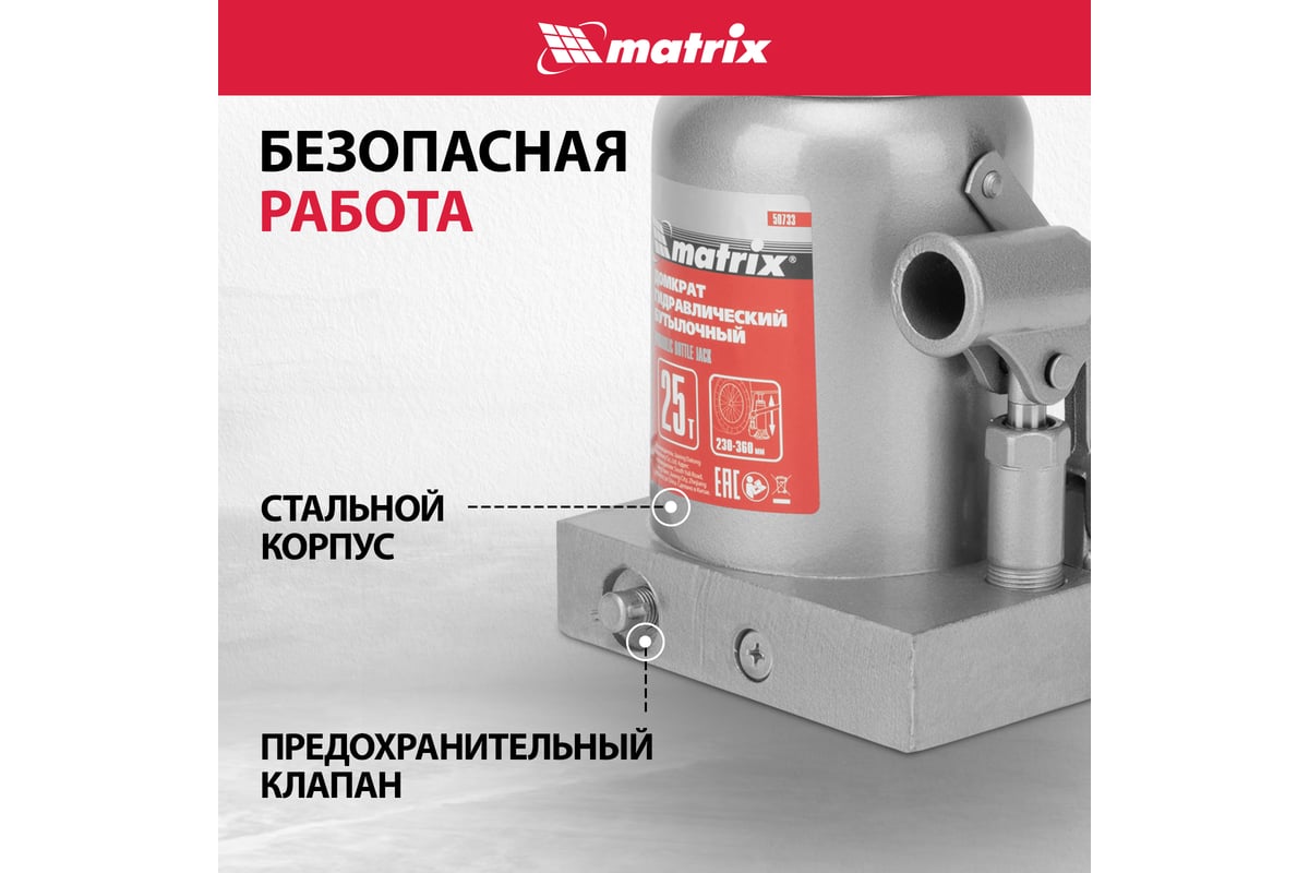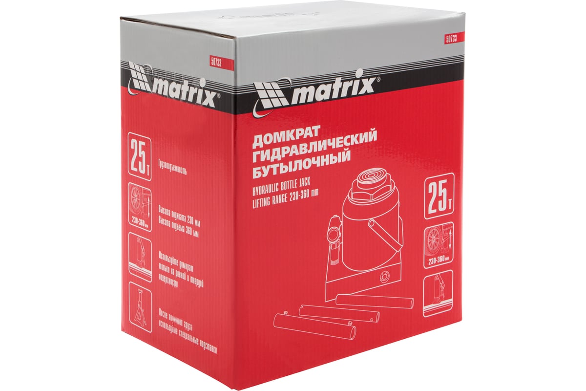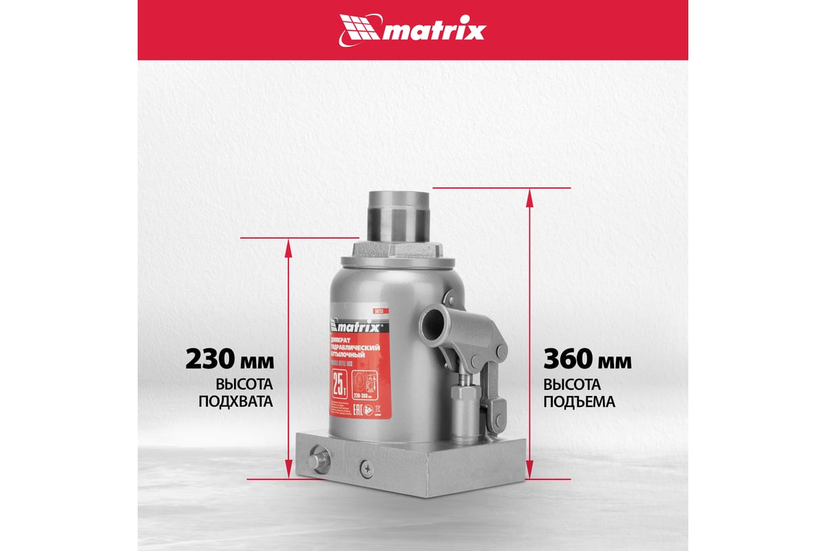 Характеристики Домкрат MATRIX 50733 бутылочный 25т h подъема 240–375мм