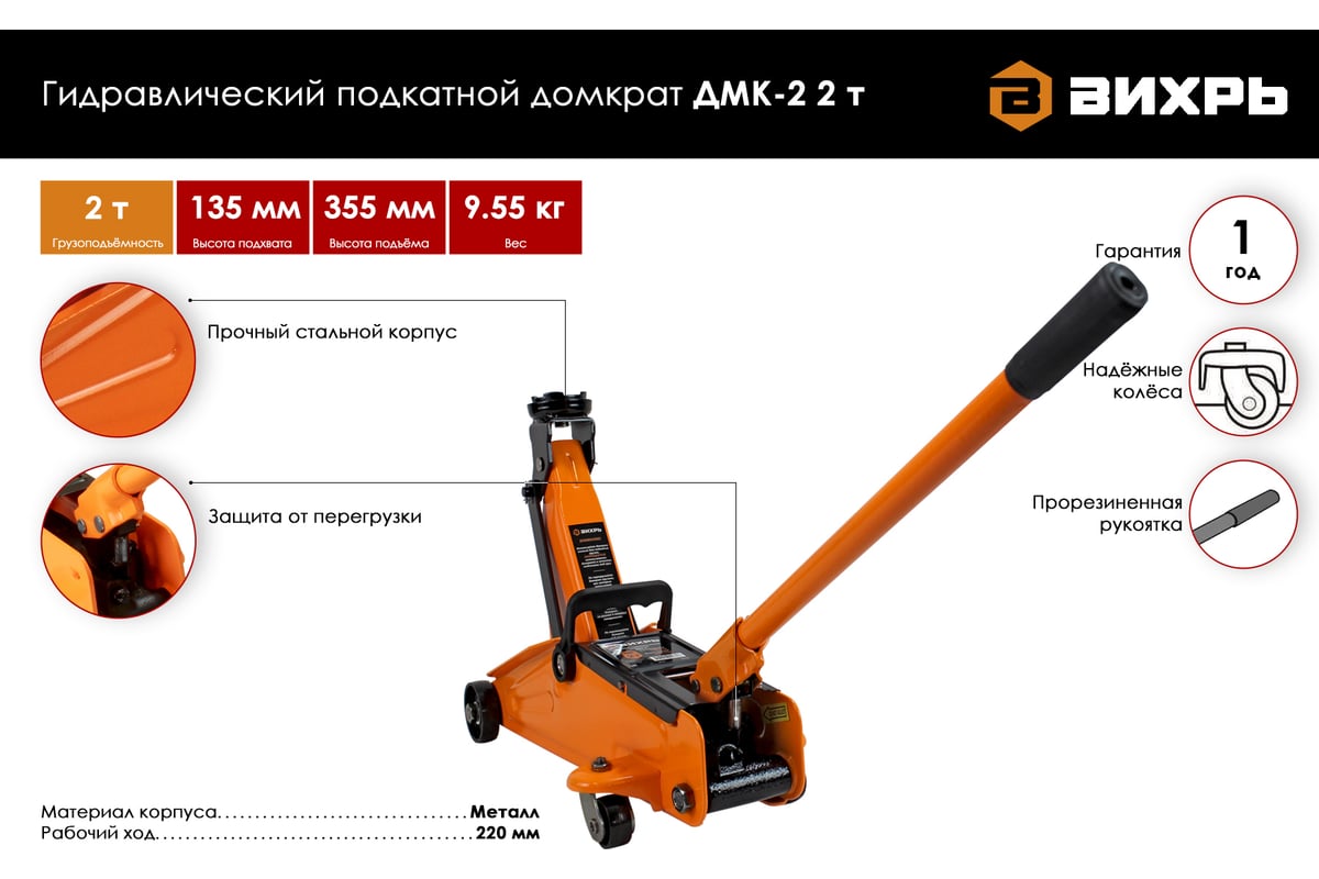 Характеристики Домкрат ВИХРЬ ДМК-2 2т,135-355мм, гидравлический подкатной