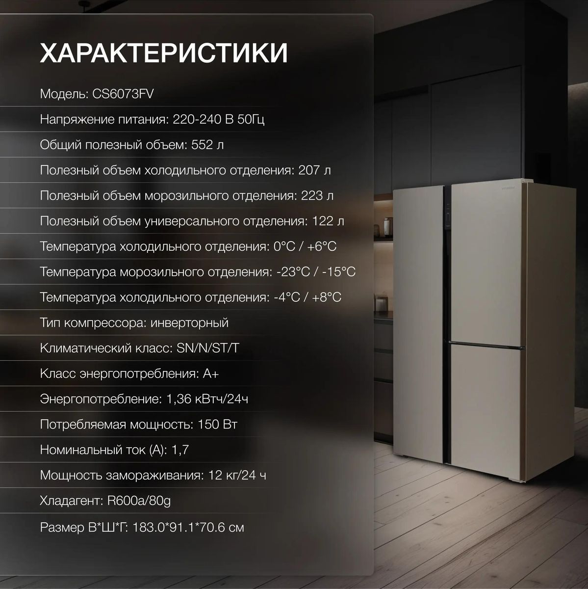 Характеристики Холодильник Hyundai CS6073FV шампань стекло трехкамерный 329/223л морозилка сбоку