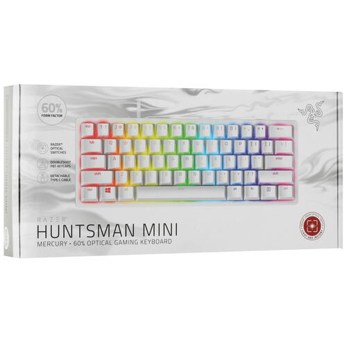 Клавиатура проводная Razer Huntsman Mini [RZ03-03392200-R3R1] представлена в прочном корпусе из металла и пластика с упрощенным дизайном скелетон. Формат 60% экономит место на столе, позволяя разместить устройство вместе с мышкой на одном коврике. Имеется 61 программируемые клавиши из PBT-полимера с удобными линейными переключателями. Устройство Razer Huntsman Mini [RZ03-03392200-R3R1] идет в комплекте со съемным USB-кабелем, удобным для подключения к игровому ПК, ноутбуку и даже ТВ. Аналоговая оптическая модель Razer позволяет настраивать удобную для вас глубину срабатывания (силу нажатия). На фоне белого цвета особенно эффектно смотрится цветная RGB-подсветка.