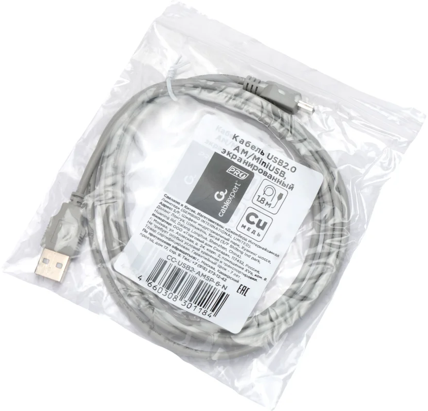 Кабель USB2.0 Cablexpert CC-USB2-AM5P-6-N, AM/MiniUSB, медь, экран, Pro, 1.8м серый, пакет