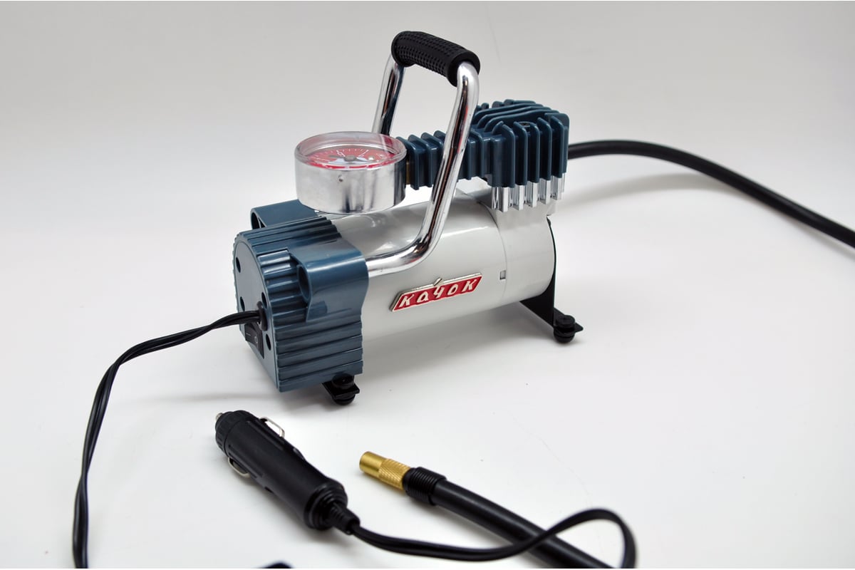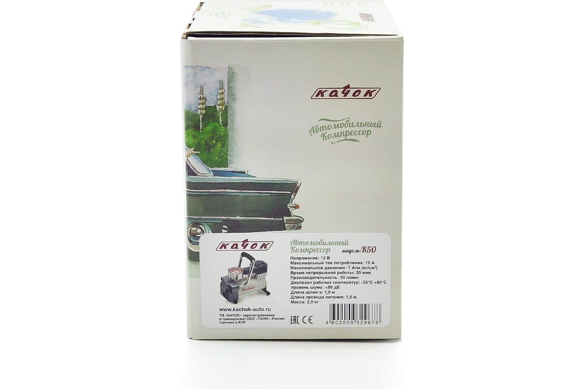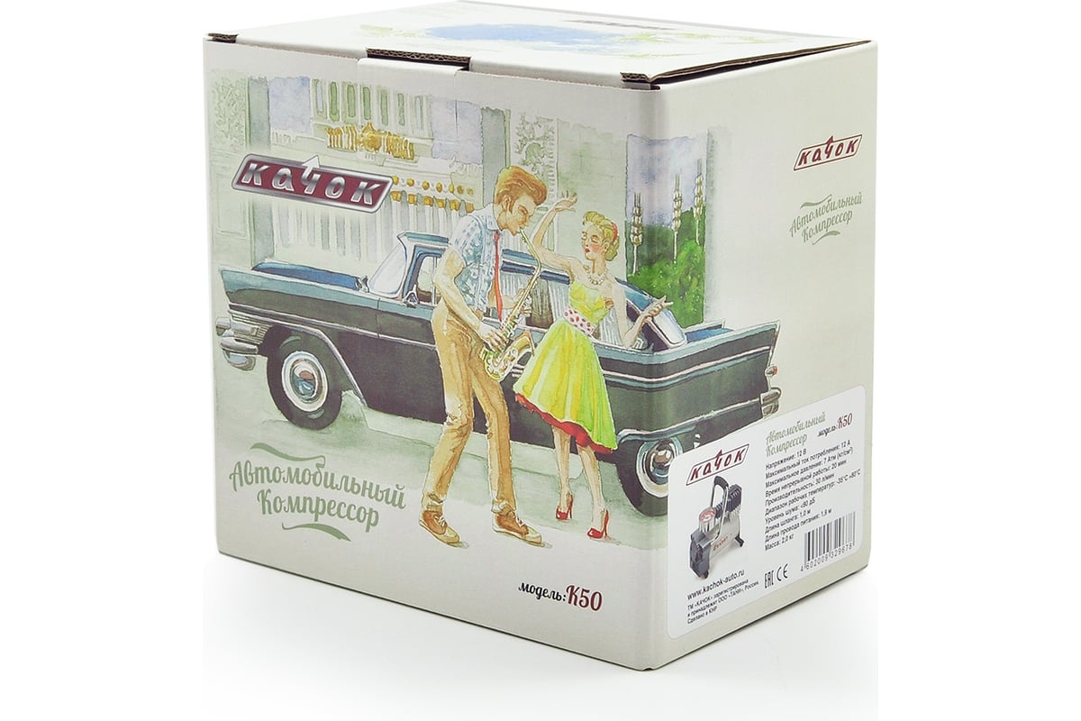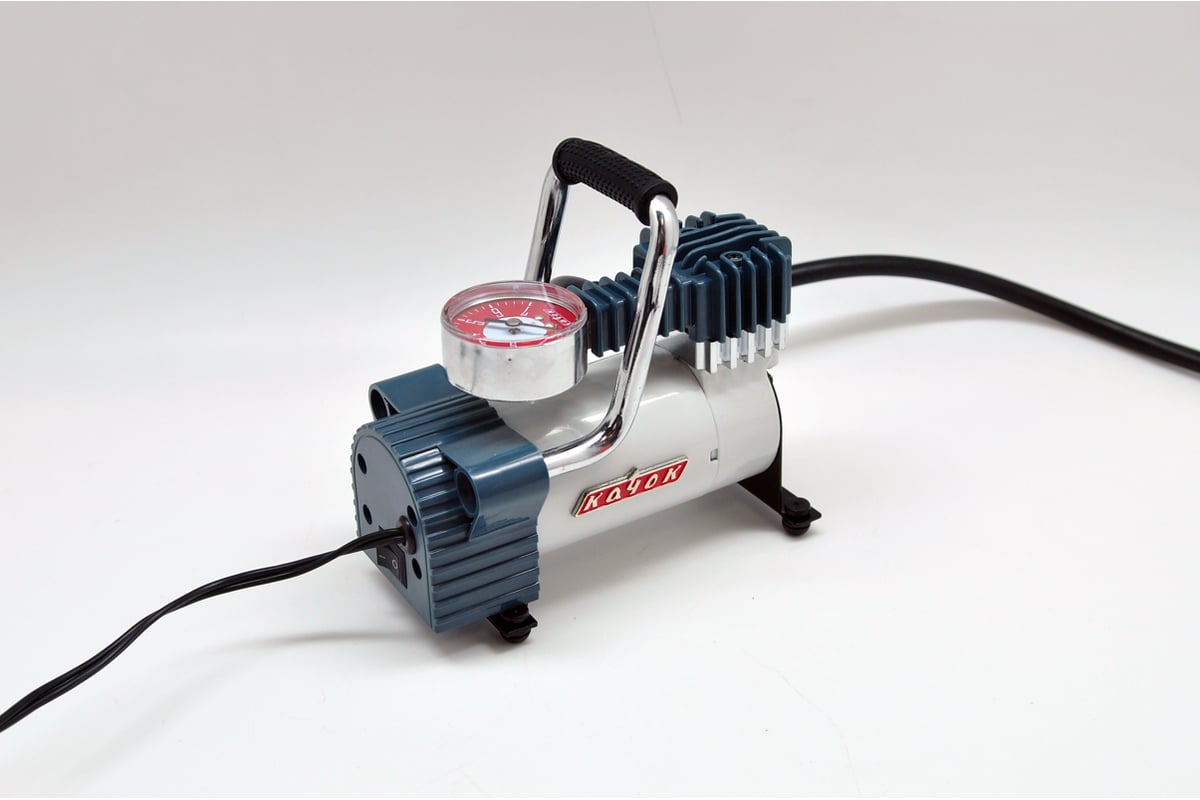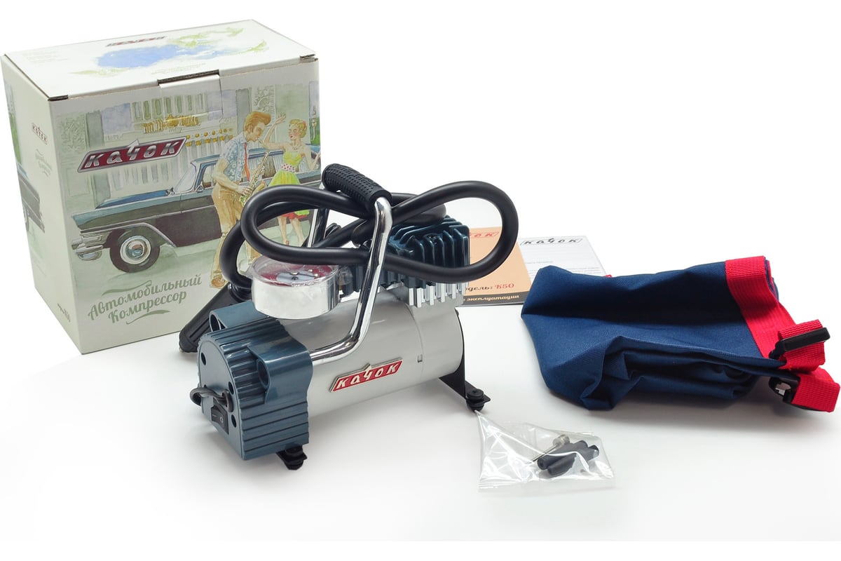 Компрессор для шин Качок K 50 отличается повышенной мощностью. Встроенный манометр, с помощью которого можно контролировать внутреннее давление, находится сверху. Яркая желтая расцветка обладает светоотражающими свойствами. Крепеж на ниппель представляет собой латунный штуцер. Переходные штуцеры входят в комплект. Качок K 50 упакован в сумку из плотного материала, предназначенную для хранения и транспортировки. Работать без перерыва Качок K 50 позволяет в течение 30 минут. По истечении этого времени необходимо дать компрессору отдохнуть. Эксплуатация Качок K 50 возможна при температуре от -35 до +80 градусов Цельсия. Модель Качок K 50 оснащена амортизационной опорой, упрощающей работу. Питание компрессора происходит при подключении к электроприкуривателю. Длина шнура питания значительная (2 м), что позволяет использовать устройство на некотором отдалении от автомобиля.