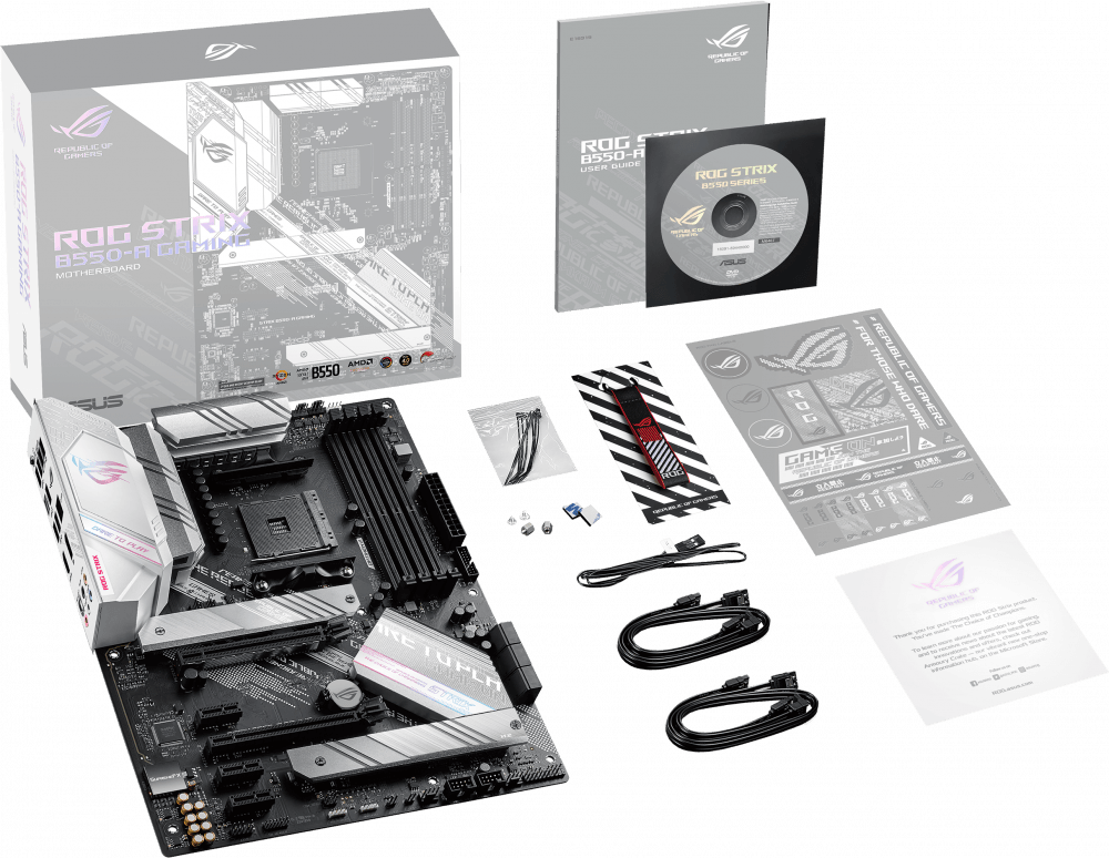 - 2 кабеля SATA, стикеры ROG, стяжки для кабелей, кабель расширения для Addressable LED, упаковка винтов для M.2