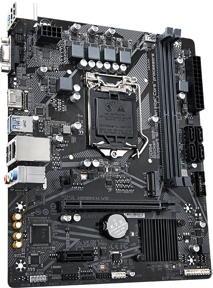 Сетевой адаптер Realtek с пропускной способностью 1000 Мбит/с обеспечивает стабильную связь с Интернет. Для подключения внешних устройств предусмотрены востребованные порты и разъемы. Тщательное тестирование и надежные компоненты гарантируют высокий уровень надежности материнской платы GIGABYTE H510M H V2.