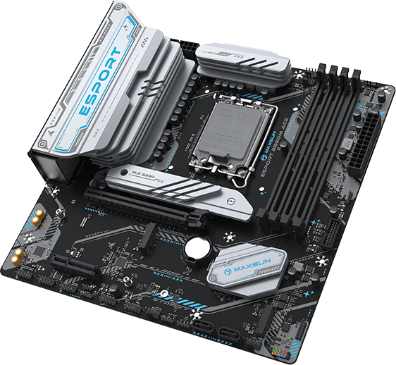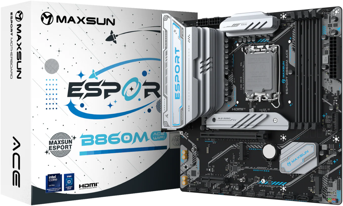Материнская плата Maxsun MS-eSport B860M WIFI ACE B860, LGA1851, 4*DDR5, 1*PCIEx16, 1*PCIEx4, 3*M.2, 7*USB3.2Gen1, 7*USB2.0, 2*SATA3.0, 2.5G, Type-C(DP), DP, HDMI, M-ATX, RTL