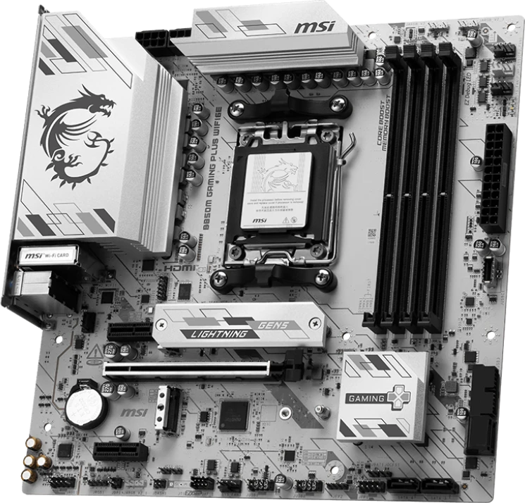 Характеристики Материнская плата MSI B850M GAMING PLUS WIFI6E SocketAM5 AMD B850 4xDDR5 mATX AC`97 8ch(7.1) 2.5Gg RAID+HDMI+DP
