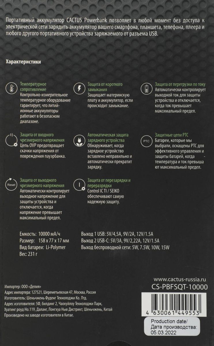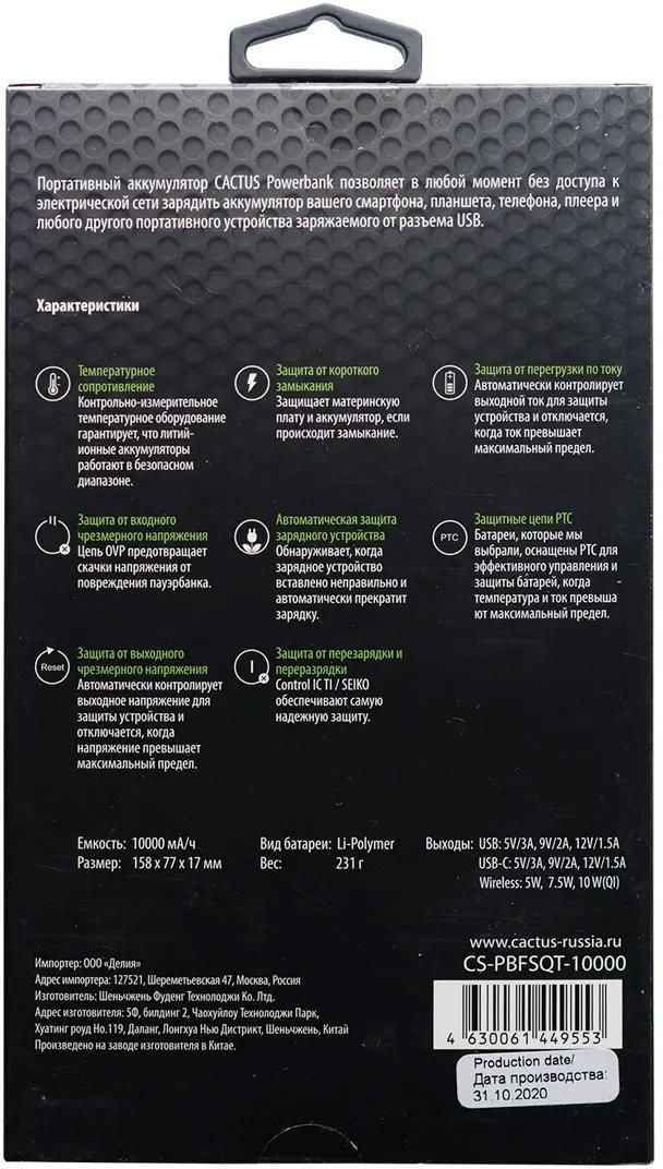Характеристики Мобильный аккумулятор Cactus CS-PBFSQT-10000