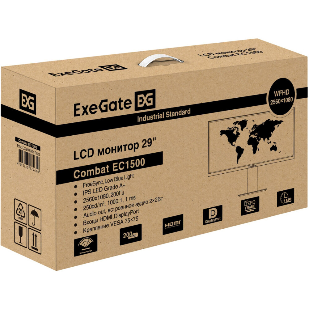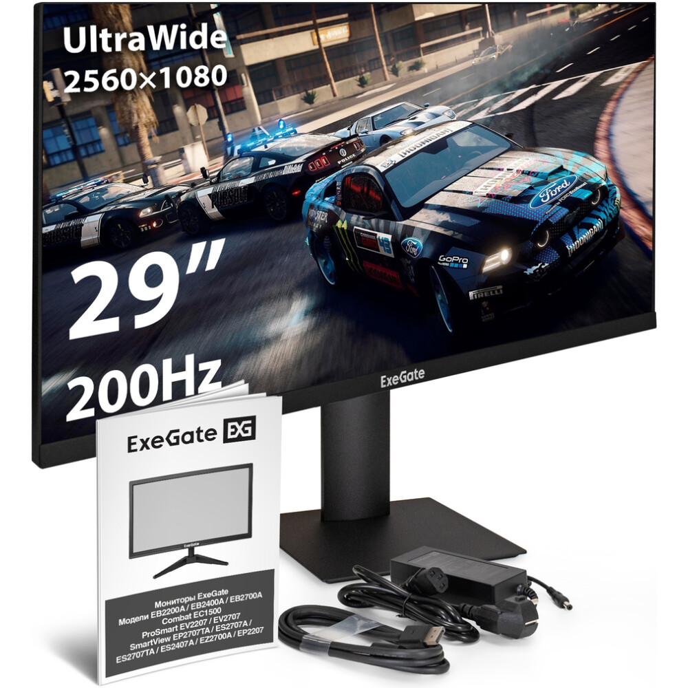 Монитор игровой 200 Гц 29 ExeGate Combat EC1500 (IPS LED Grade A+, 2K, 2560x1080@200Гц (WFHD), 21:9, 250 cd/m2, 1000:1, 178°/178°, 1ms, Speakers, 2xHDMI2.0, 2xDisplayPort, audio-out, RGB-подсветка, FreeSync, Low Blue Light, кабель DP 1.5м, VESA 75x75, рег