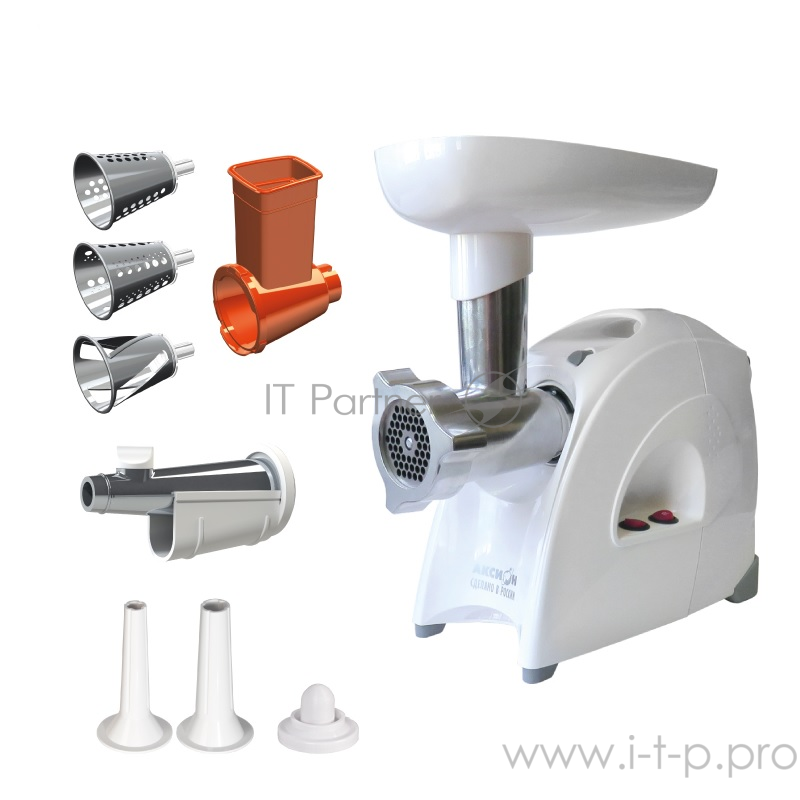 Характеристики Мясорубка АКСИОН М641.02 БелыйМаксимальная мощность - 2000 Вт Производительность – до 3 кг/мин. В комплекте:приставка для набивки колбас; кеббе; шнековая соковыжималка; овощерезка; нож с саблевидной режущей кромкой из нержавеющей стали; 2 решетки увеличе