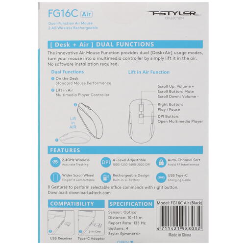 Мышь беспроводная A4Tech Fstyler FG16C Air обладает симметричной формой корпуса и размерами 64x36x109 мм, благодаря чему обеспечивается комфортный и уверенный хват правой или левой рукой. Устройство представлено в классическом черном цвете и располагает 4 кнопками для удобства работы в различных приложениях. Одна из кнопок позволит установить комфортное разрешение оптического светодиодного датчика, выбрав один из четырех вариантов: 1000 dpi, 1200 dpi, 1600 dpi или 2000 dpi. Корпус мыши A4Tech Fstyler FG16C Air выполнен из матового пластика, благодаря чему на нем не будут видны отпечатки пальцев.
