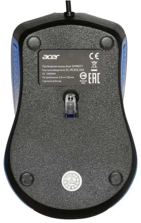 Характеристики Мышь проводная Acer OMW011 черный/синий, 1200 dpi, USB, кнопки - 3