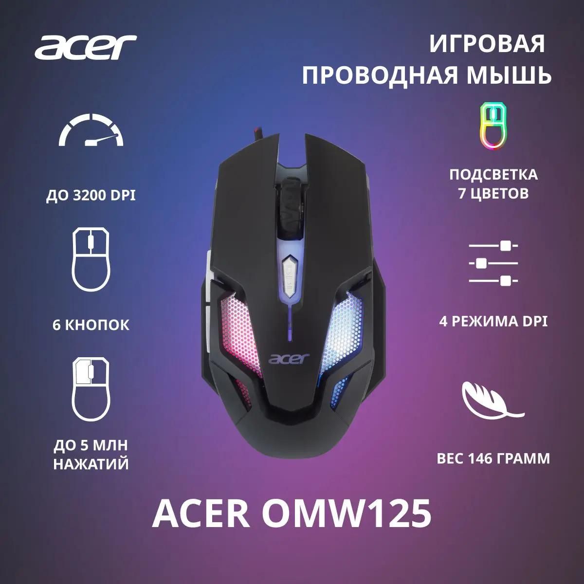 Мышь проводная Acer OMW125 [ZL.MCEEE.00Z] в черно-сером пластиковом корпусе подходит для использования с игровым компьютером или ноутбуком и оснащается 6 клавишами с легким и четким срабатыванием. Среди них предусмотрен переключатель для смены чувствительности светодиодного оптического сенсора в диапазоне 800-3200 dpi, благодаря которому вы сможете добиться желаемой точности управления курсором. Мышь оснащается также боковыми кнопками для выполнения различных действий. Компьютерная мышь с проводным подключением Acer OMW125 [ZL.MCEEE.00Z] получает кабель с коннектором USB Type-A длиной 1.8 м. Она получает питание по шине, поэтому батарейки или аккумуляторы не требуются для обеспечения ее работоспособности. Особенностью геймерской мыши, рассчитанной на управление правой рукой, является наличие эффектной встроенной подсветки на многоцветных светодиодах.