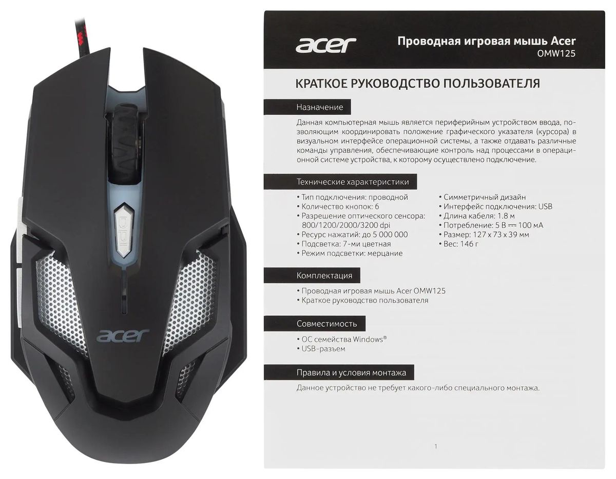 Описание Мышь проводная Acer OMW125 (ZL.MCEEE.00Z) Чёрный