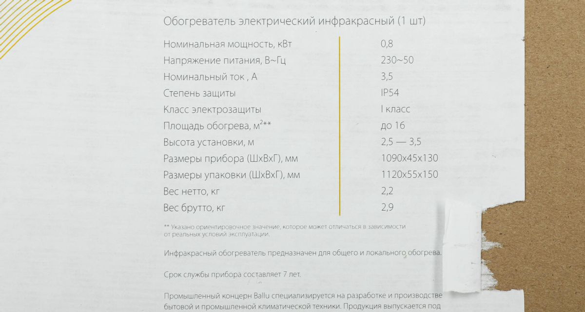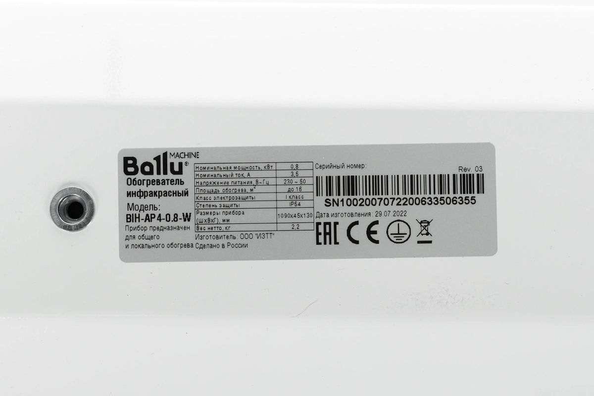 Характеристики Обогреватель инфракрасный Ballu BIH-AP4-0.8-W 800Вт белый