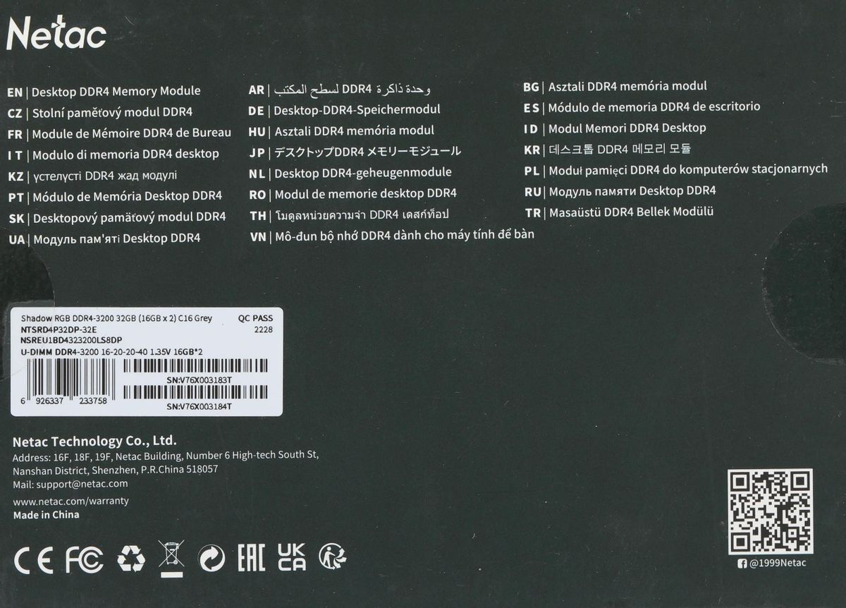 Оперативная память DIMM Netac Shadow RGB DDR4 32Gb NTSRD4P32DP-32E (2x16Gb)