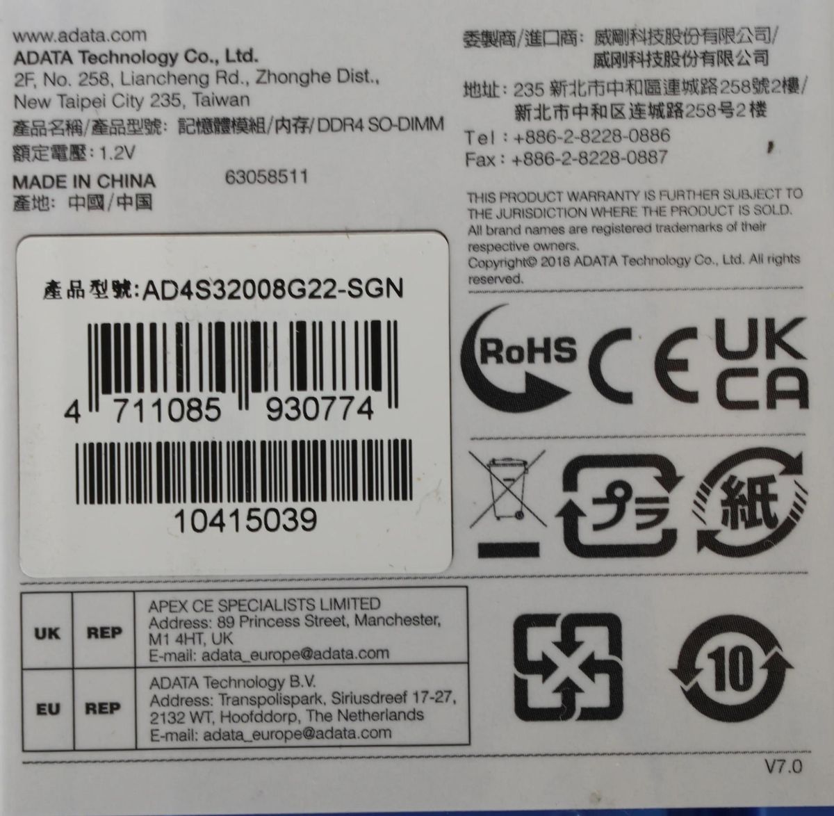 Характеристики Оперативная память SO-DIMM ADATA DDR4 8Gb 3200MHz AD4S32008G22-SGN