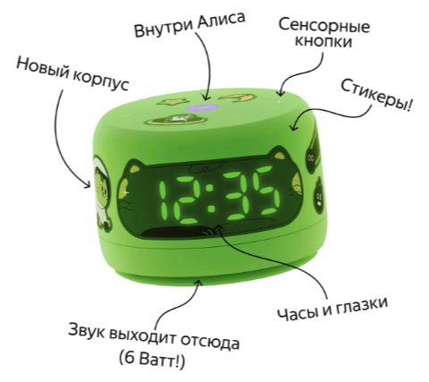 Питается устройство от сети через удобный разъём USB Type-C, что делает его расположение гибким. Лаконичный пластиковый корпус в насыщенном зелёном цвете добавит в ваш дом яркий акцент. В комплекте вы найдёте всё необходимое для старта: адаптер питания и забавный набор наклеек, которые позволят персонализировать колонку, придав ей уникальный вид.
