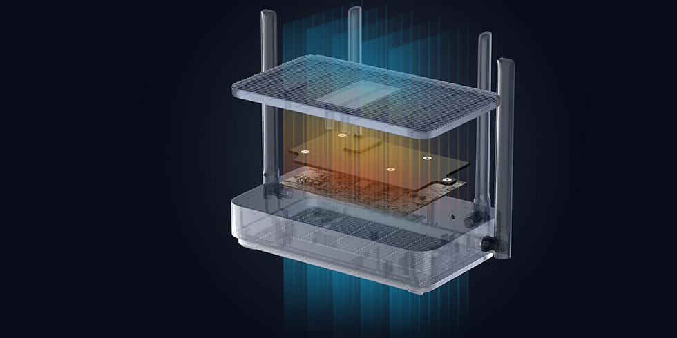 Как и у мощных компьютеров, у роутера Redmi AX5 есть большой алюминиевый радиатор, который плотно контактирует с чипами за счет слоя особой термопасты. На верхней и нижней панели роутера предусмотрены отверстия для отвода тепла и формирования циркулирующего потока воздуха. Такая система охлаждения обеспечит длительную работу даже под большой нагрузкой.